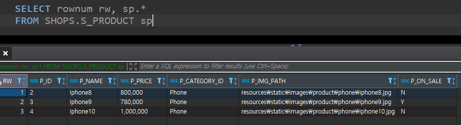 현재 테이블의 상태는 다음과 같습니다., rownum을 통해 행 번호를 매길 수 있습니다.
